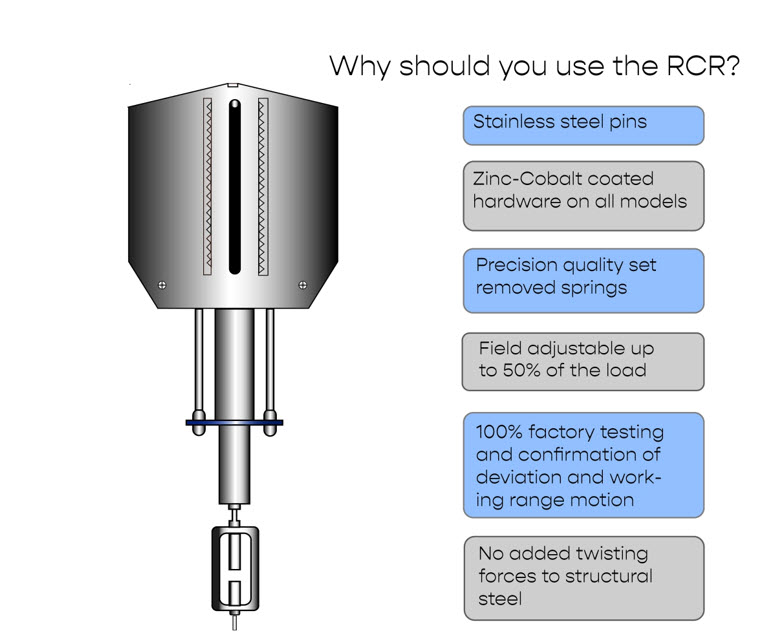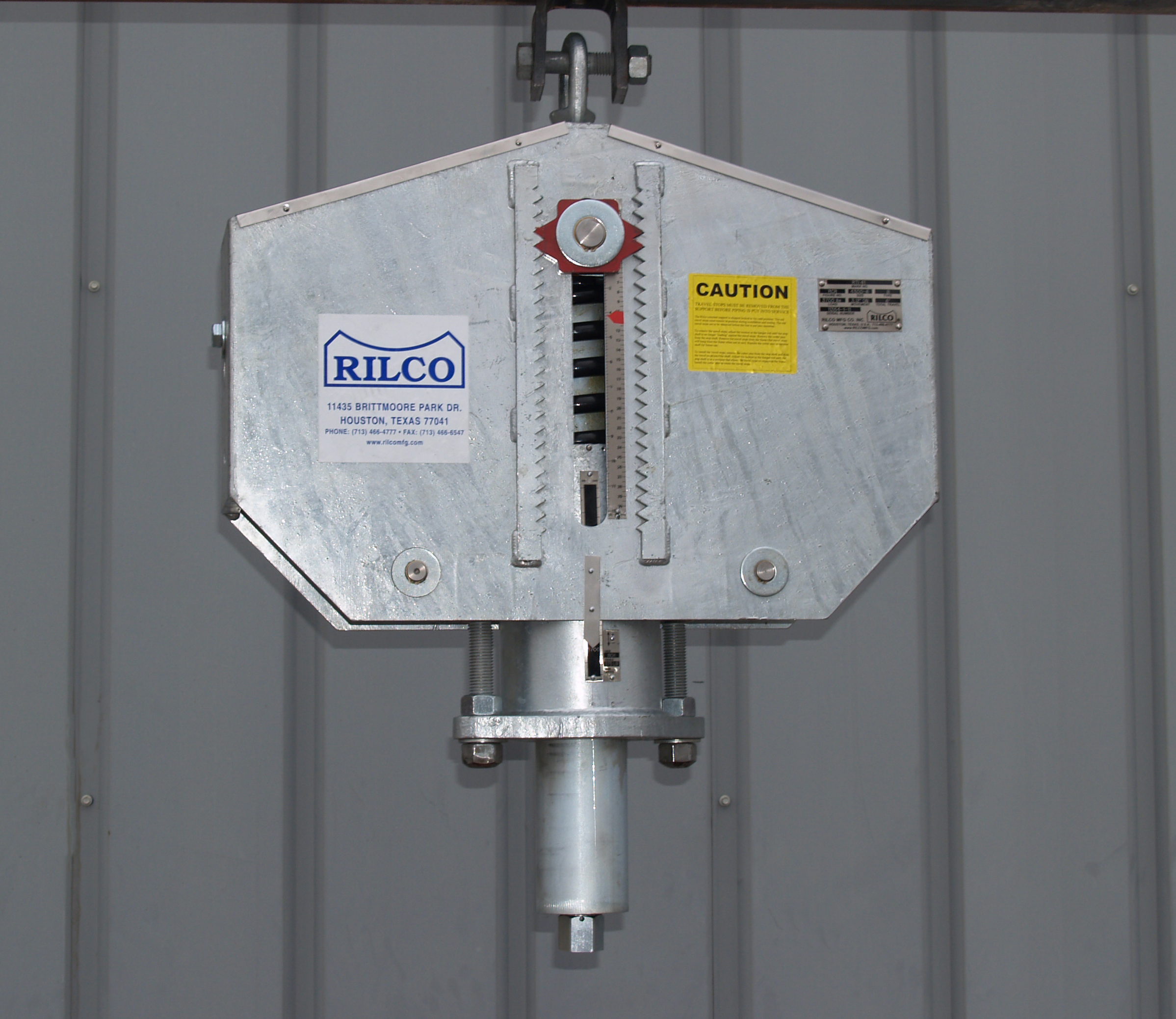 RCR constants are fabricated utilizing a space saving, balanced design which utilizes standard Rilco hang- er hardware. Site installation is enhanced via the use of the centered, single point connection. RCR constants transfer the load directly through the center of the body, eliminating the moment imposed on the supporting members typically seen with the use standard lever arm constants. The interpretation of the vertical displacement of the supported piping is made simpler through the use of a direct reading travel indicator.