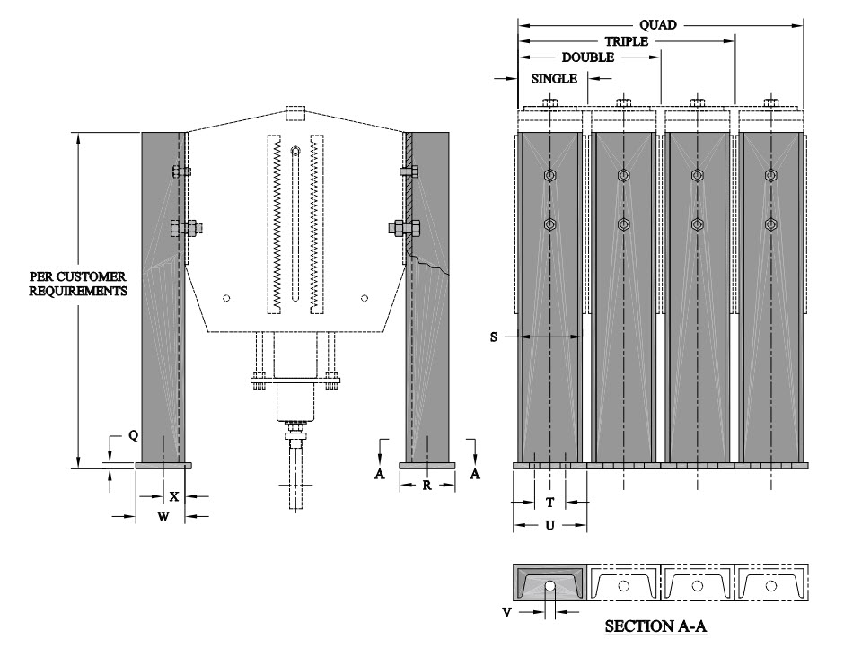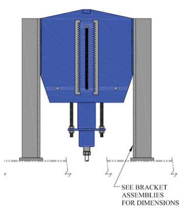 The lower attachment point consists of a turnbuckle with right hand threads for the hanger rod connection for single unit assemblies. Multiple unit assemblies also utilize the auxiliary side brackets, but use a single common lug for the bottom connection. They require a clevis or a double lug arrangement for the lower connection.