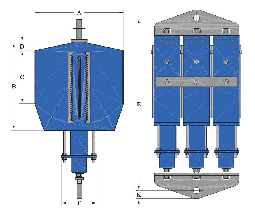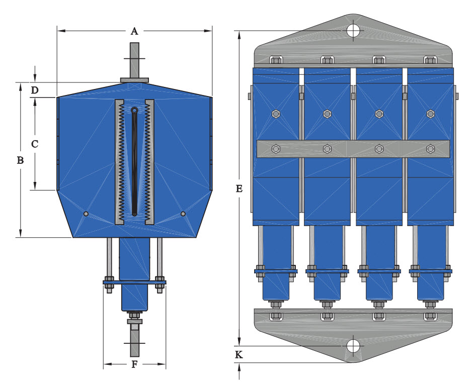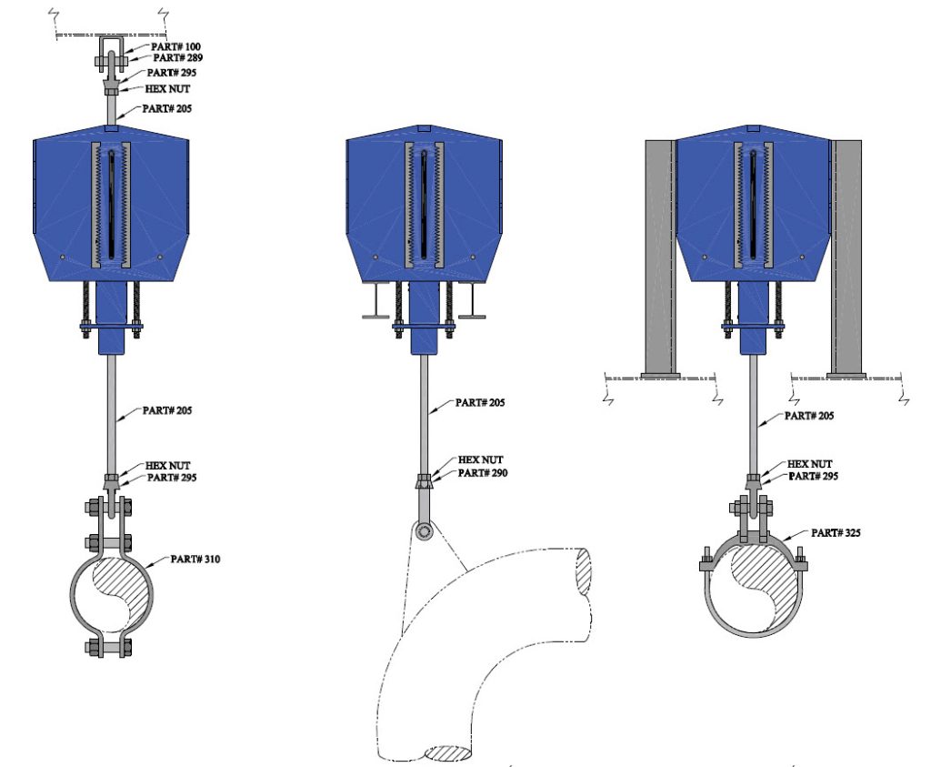 The lower attachment point consists of a turnbuckle with right hand threads for the hanger rod connection for single unit assemblies. Multiple unit assemblies use a single common lug for the bottom connection. They require a clevis or a double lug arrangement for the lower connection.