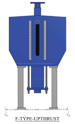 Type F or upthrust type uses two attached stand-offs to support the RCR assembly with a load column and pad protruding through the top. This arrangement is used when supporting lines or vessels from below. The stand-offs are typically attached to either structural steel or concrete. These offer the same performance and adjustability the other RCR assemblies offer.