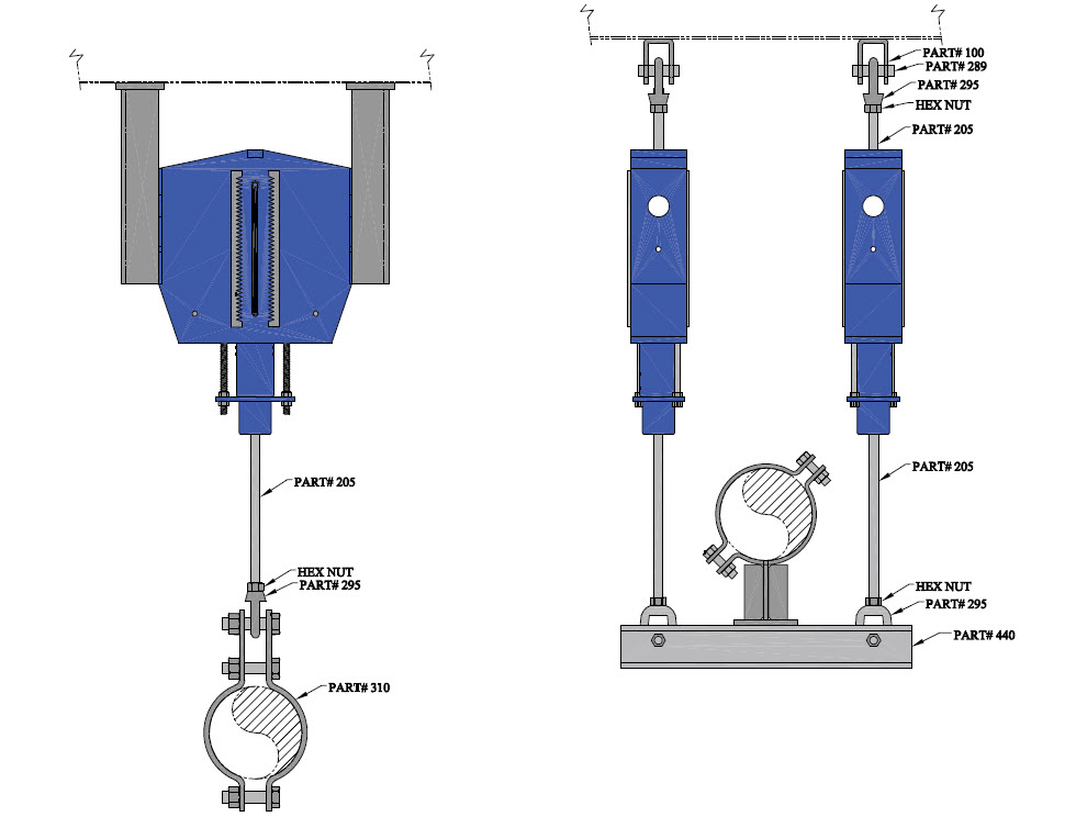 The hanger rod diameters for both the top and the bottom connections will be driven by the size of constant selected. (single unit assembly shown)
